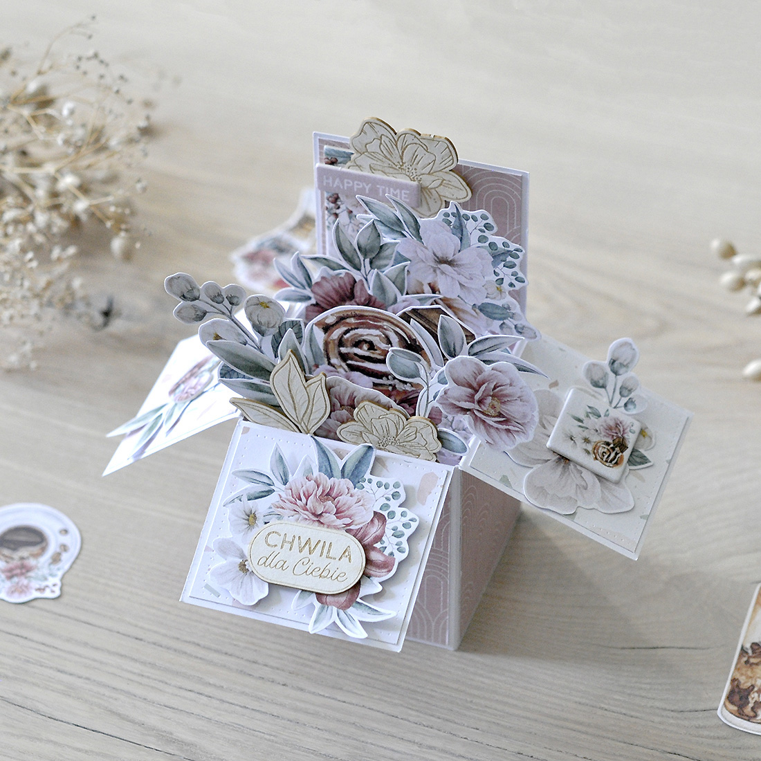 Buduje i ozdabia specjalnie zaprojektowaną do warsztatów ozdobę 3D, do umieszczenia w centrum exploding boxa. Inspiruje do tworzenia małych i uroczych kompozycji na niewielkich powierzchniach wieczka, boków i klapek. Pokazuje jak wykorzystać do tego takie dodatki jak wycinane z papieru elementy, tagi, chipboardy, grawerowane tekturki i papierowe kwiatki.